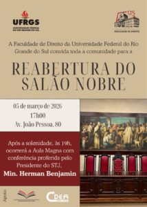 Após longos anos de interdição, na próxima quinta-feira (05 de março), ocorrerá a reabertura do Salão Nobre na Faculdade de Direito da UFRGS, marcando a devolução à sociedade de um dos espaços acadêmicos mais simbólicos da Universidade. Mais do que a recuperação de um ambiente histórico, a retomada restitui à UFRGS um lugar de forte valor institucional e memorial, tradicionalmente vinculado à realização de conferências, cursos, cerimônias e outros encontros acadêmicos que ajudam a preservar a história e a identidade da Faculdade de Direito. Os esforços foram imensos para recolocá-lo nas devidas condições, e envolveram muitos dos associados do Instituto de Estudos Culturalistas.